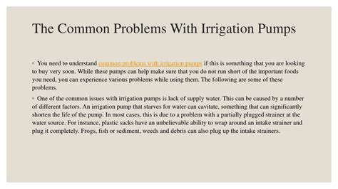 Irrigation pumps are an essential tool for farmers and gardeners alike, providing a reliable source of water to crops and plants. However, like any piece of machinery, irrigation pumps can encounter several problems that can significantly impact their function. In this article, we will be discussing some of the most common problems with irrigation pumps and how to fix them.